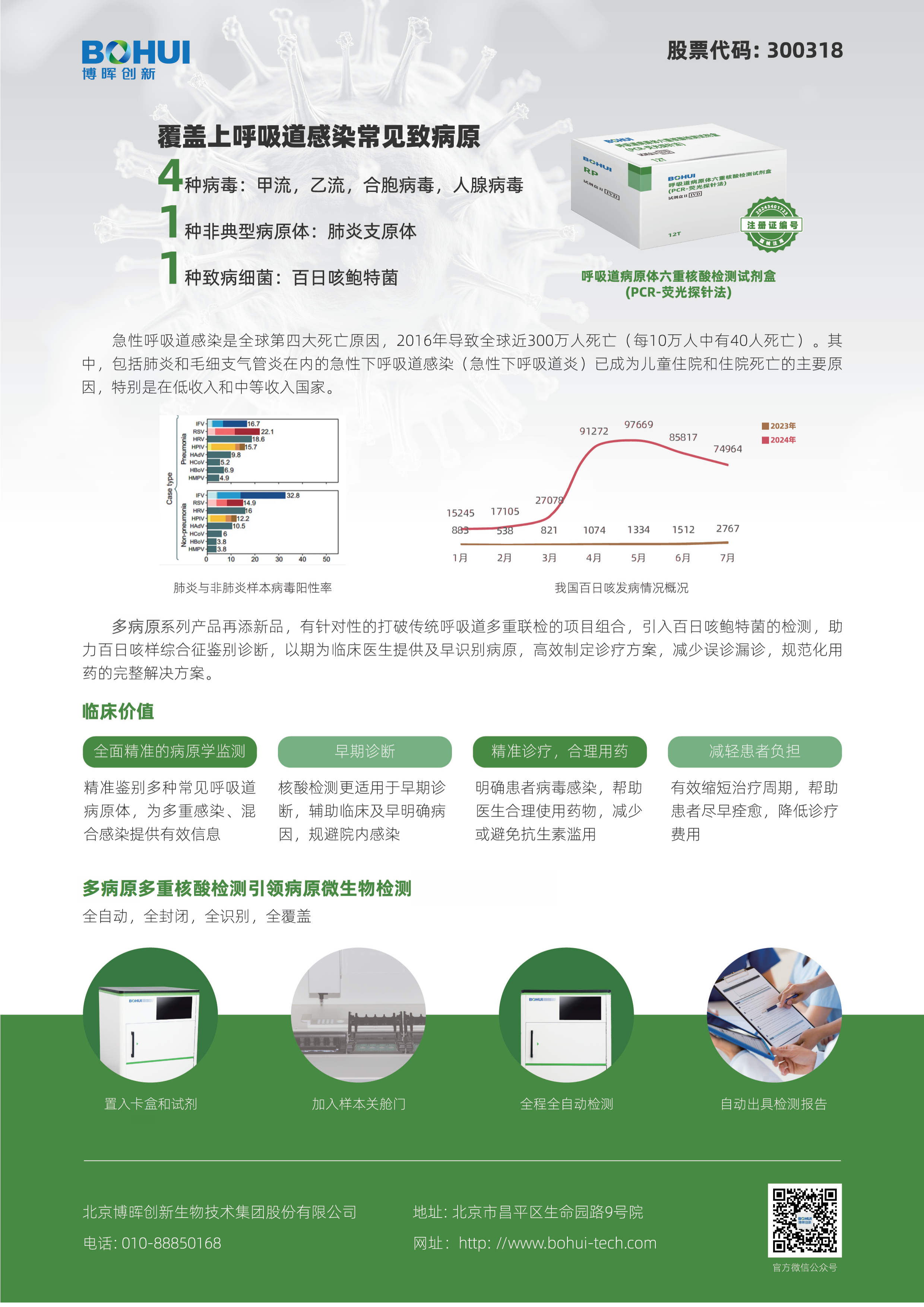 面對潛在的跨境傳播風(fēng)險,早期精準(zhǔn)檢測是防控的關(guān)鍵環(huán)節(jié)。博暉創(chuàng)新深耕分子診斷領(lǐng)域,推出的呼吸道病原體六重核酸檢測試劑盒(國械注準(zhǔn) 20243401723)可檢測甲型流感病毒、乙型流感病毒、呼吸道合胞病 毒、腺病毒、肺炎支原體、百日咳鮑特菌,這也是目前包含百日咳多聯(lián)檢獨(dú)家解決方案,為百日咳及常見呼吸道病原體檢測提供了高效工具。該系列試劑盒采用全封閉泵液模塊結(jié)合熒光定量 PCR 技術(shù),可實(shí)現(xiàn)全自動一體化檢測,操作簡便且結(jié)果精準(zhǔn),能快速區(qū)分百日咳鮑特菌與其他呼吸道病原體,助力臨床早期診斷、及時干預(yù)。
