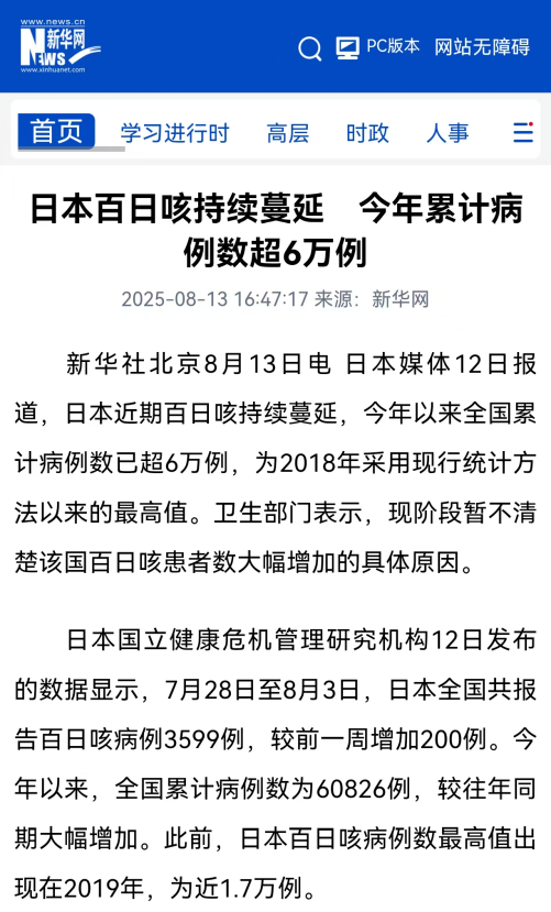 近期,日本百日咳疫情持續(xù)蔓延引發(fā)廣泛關(guān)注。據(jù)新華社報道,今年以來日本全國累計(jì)百日咳病例已超 6 萬例,較往年同期大幅激增,創(chuàng)下 2018 年采用現(xiàn)行統(tǒng)計(jì)方法以來的最高紀(jì)錄。7月28日至 8月3日單周,該國新增病例達(dá)3599 例,而2019年全年最高紀(jì)錄僅約1.7萬例,疫情形勢嚴(yán)峻。衛(wèi)生部門表示,目前暫未明確病例激增的具體原因,疫情輸入風(fēng)險不容忽視。